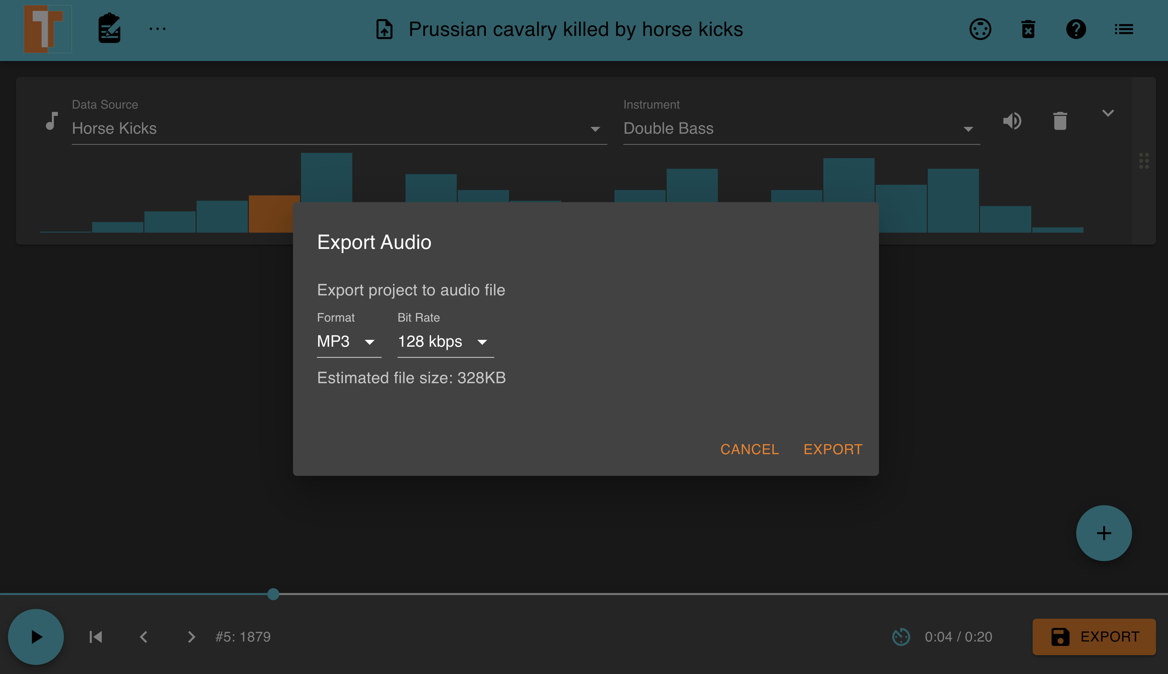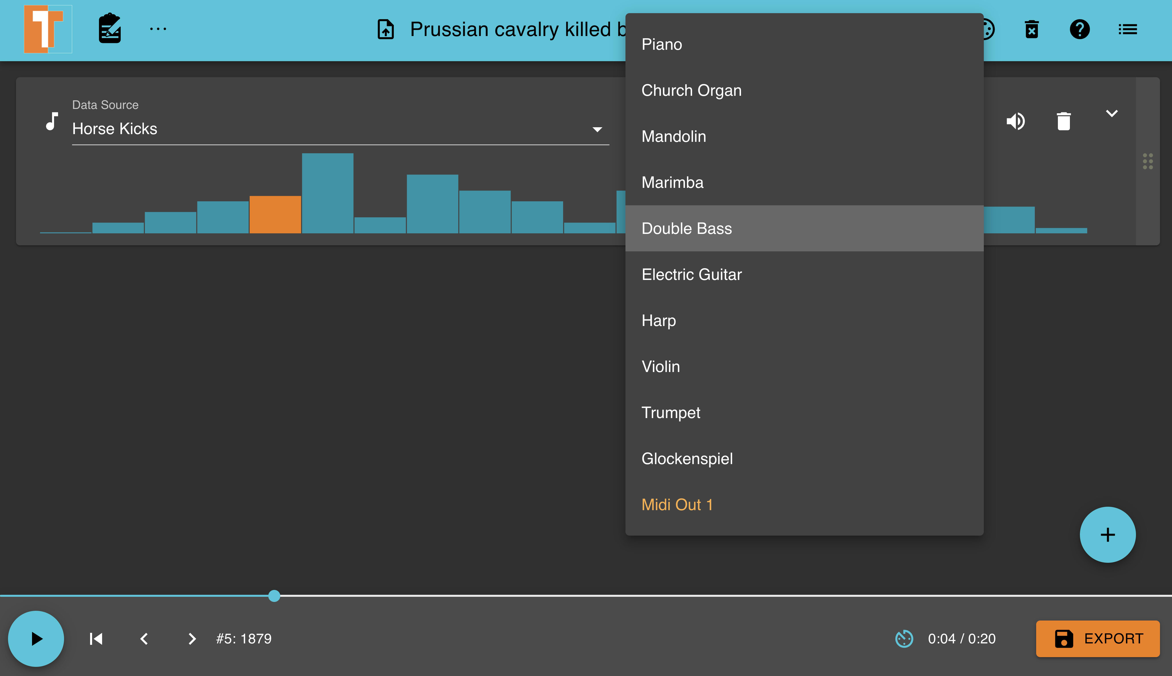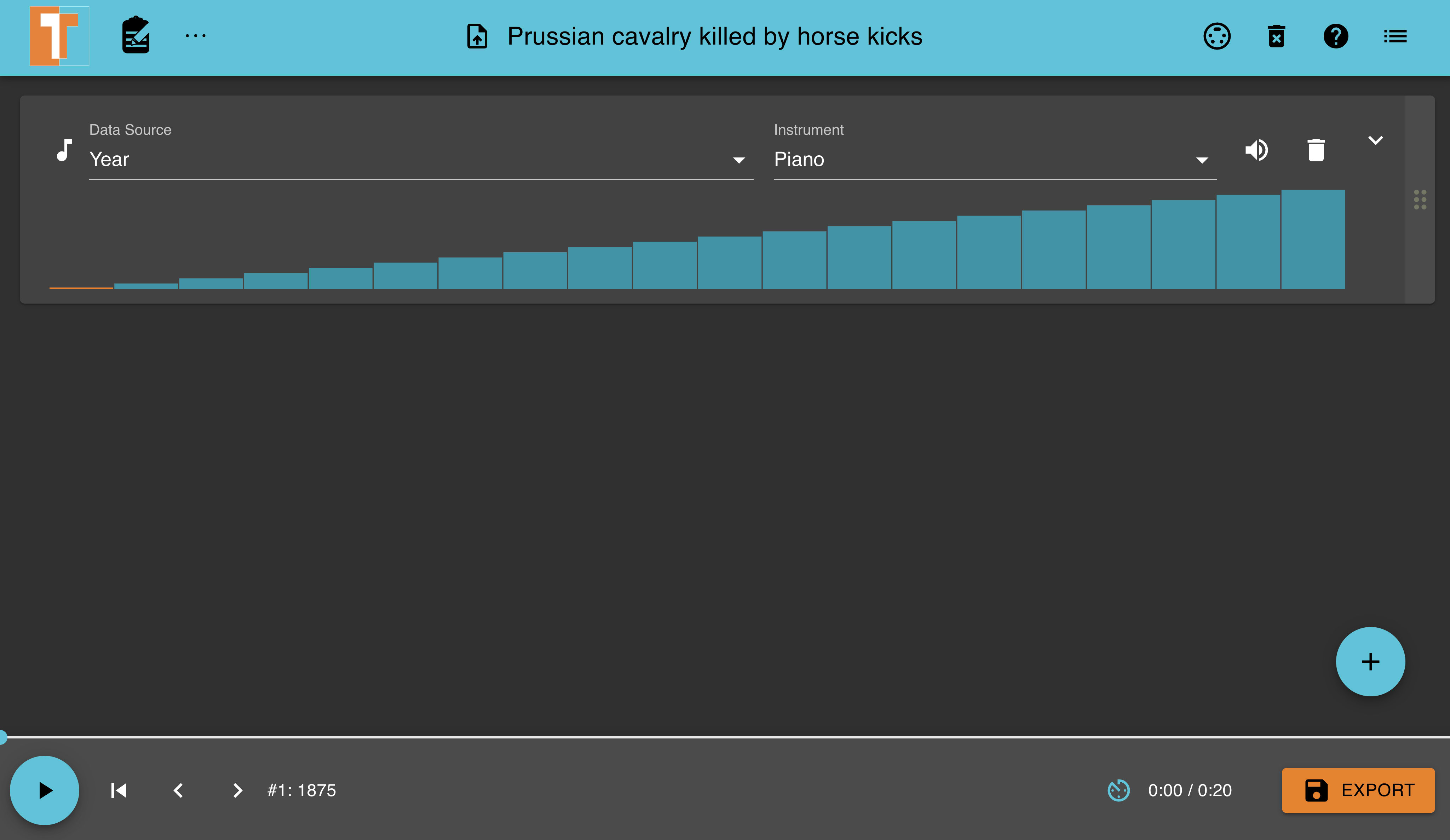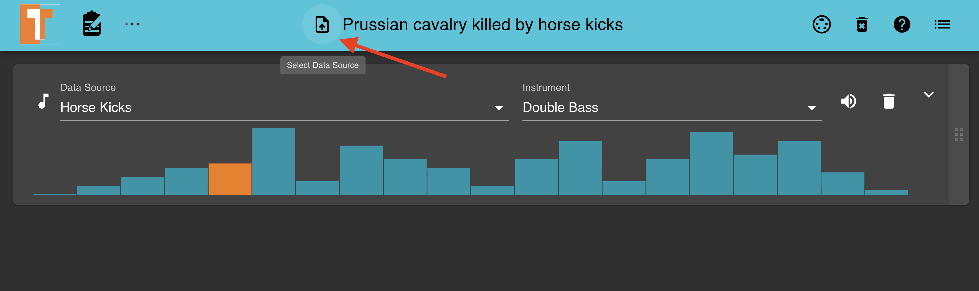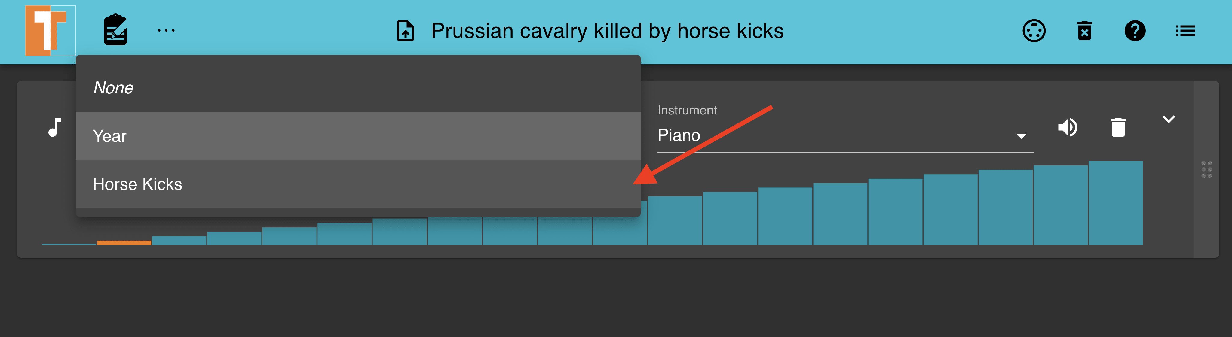 Let's spice things up with the "Prussian cavalry killed by horse kicks" dataset audio as the default ascending sounding from the Year column is somewhat bland 🥱. We can achieve this by changing the default settings and data source used to generate an audio file.