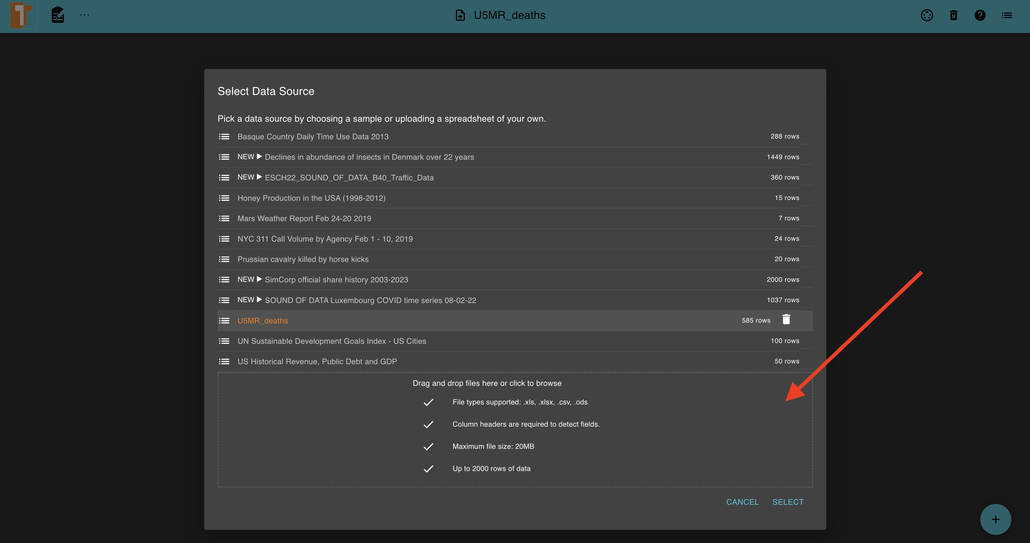 Click the file icon within the navigation bar to launch a modal for selecting a different data source.