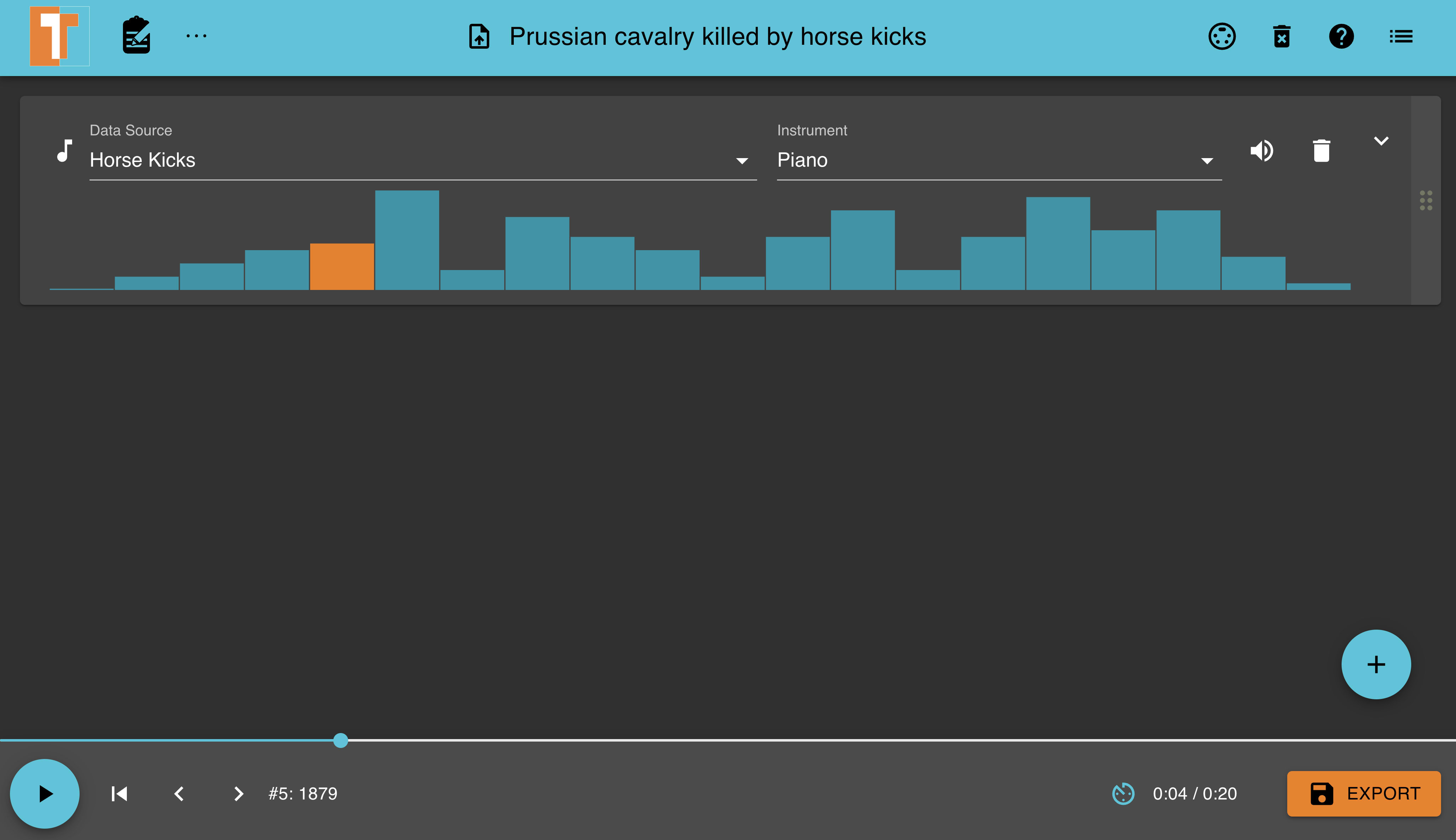 The following image shows the TrueTone player visualizing the "Prussian cavalry killed by horse kicks" dataset by the Horse Kicks.